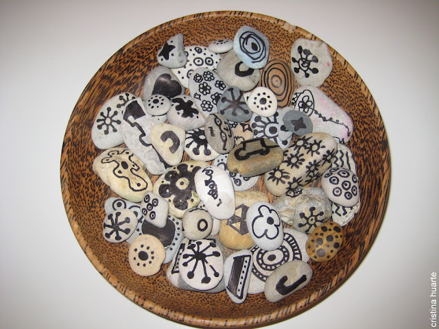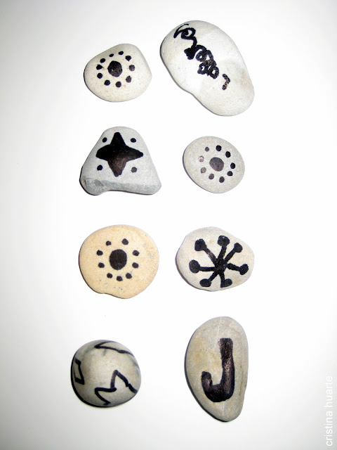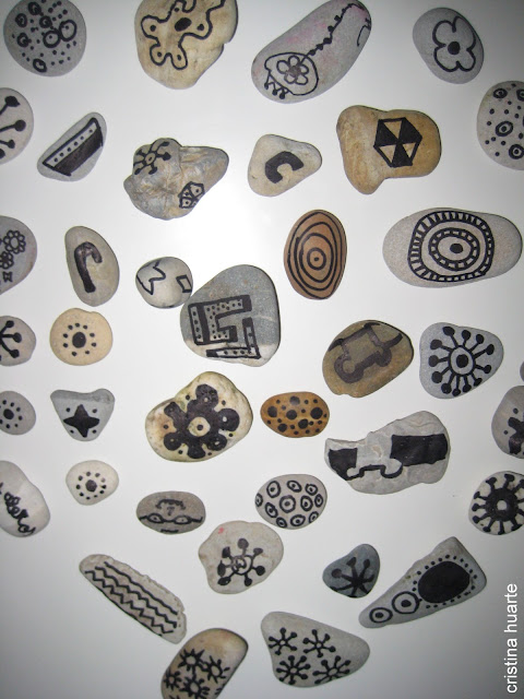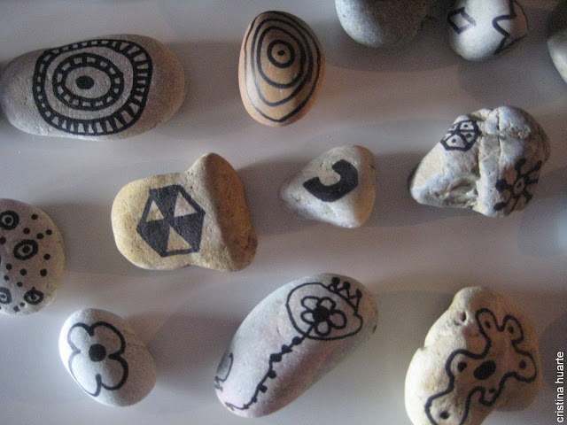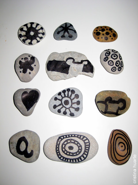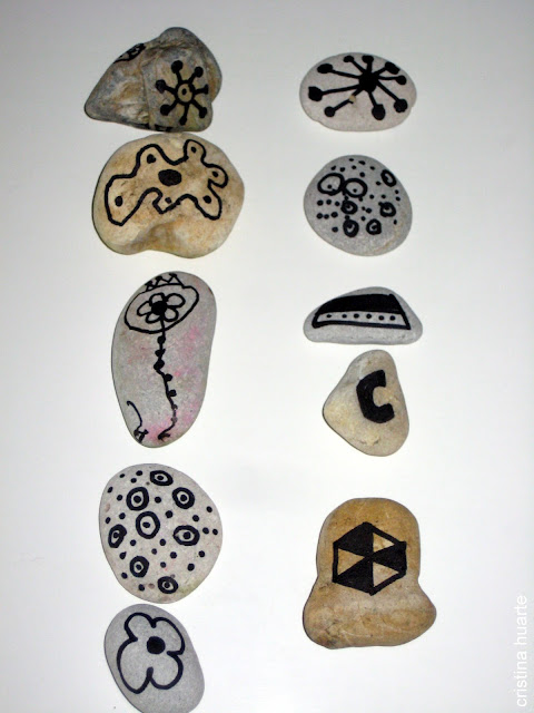 Con un saquete de piedras de la playa que guardábamos del verano pasado, nos dedicamos a hacer piedras decoradas y dibujos que se nos iban ocurriendo. Y así nos han quedado estas hermosas piedras decoradas.