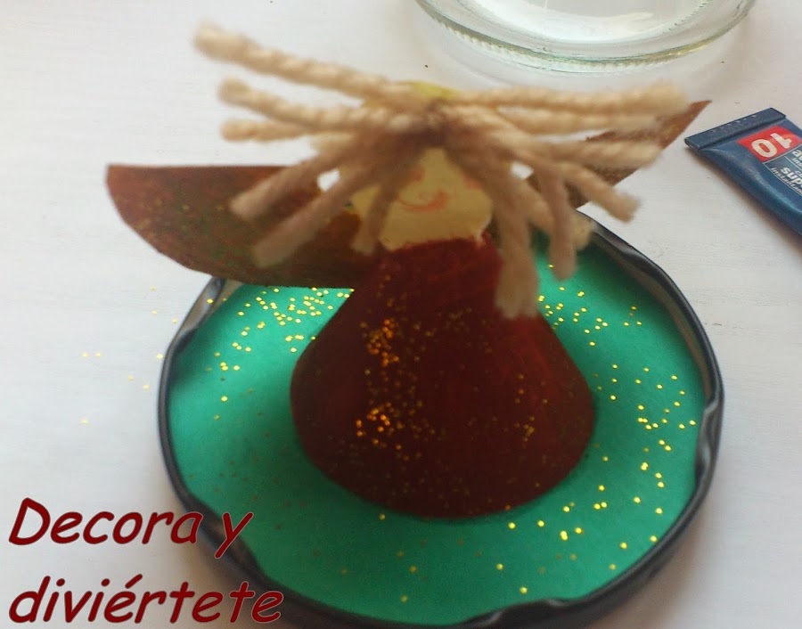 - Segundo , tenéis que pegar la figurilla o lo que queráis en la tapa del bote , por la parte de dentro .Yo le he puesto un trozo de cartulina verde y encima de esta cartulina es donde he pegado el angelito .