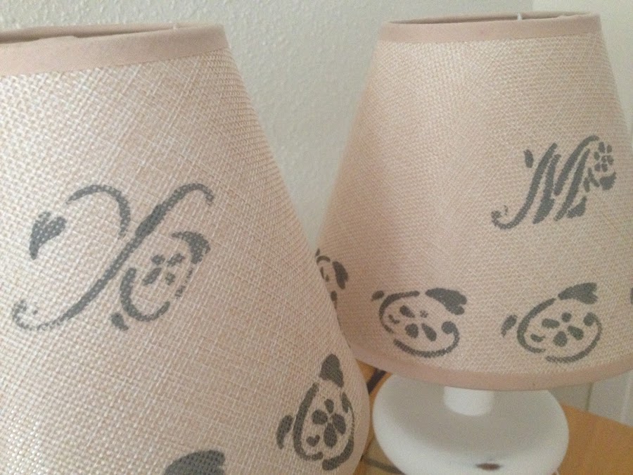 Para el estarcido elegí un motivo sencillo para rodear la base de la pantalla y luego las iniciales mía y de mi marido, puesto que las lámparas van a ir en nuestras respectivas mesillas de noche.