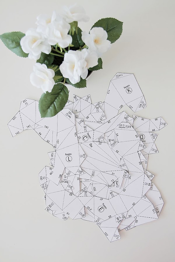 Cuando tengamos todas las partes recortadas, empezamos a doblar por las lineas de puntos. Aquí es donde necesitamos un saco de paciencia bien grande!, Tenéis que doblar hacia adentro, es decir, hacia la parte impresa, ya que eso será el interior de nuestro conejito.