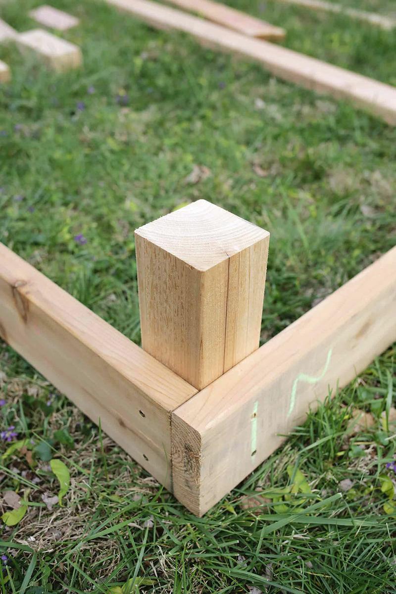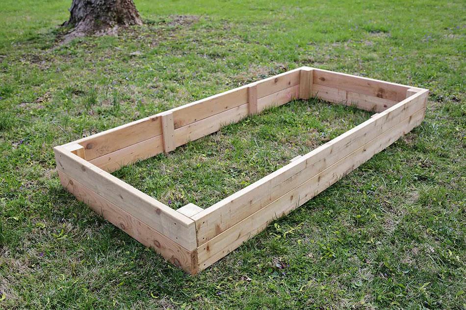Ahora ya puedes comenzar el trabajo. El primer paso será construir el armazón de madera que formará la estructura del jardín-huerto elevado. Coloca y atornilla las cuatro tablas, reforzando las esquinas con un taco de madera.
