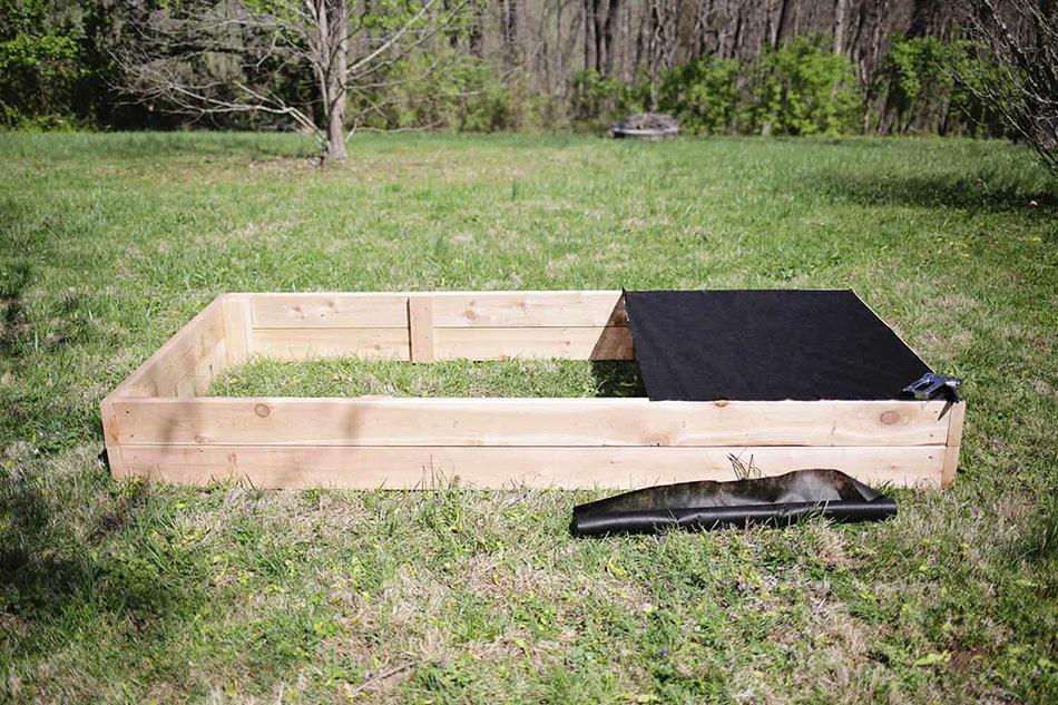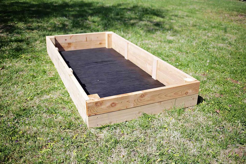 Para hacer la base del jardín-huerto elevado tendrás que grapar la malla geotextil antihierba a la parte superior de la estructura de madera que acabas de construir. Después tendrás que darle la vuelta.
