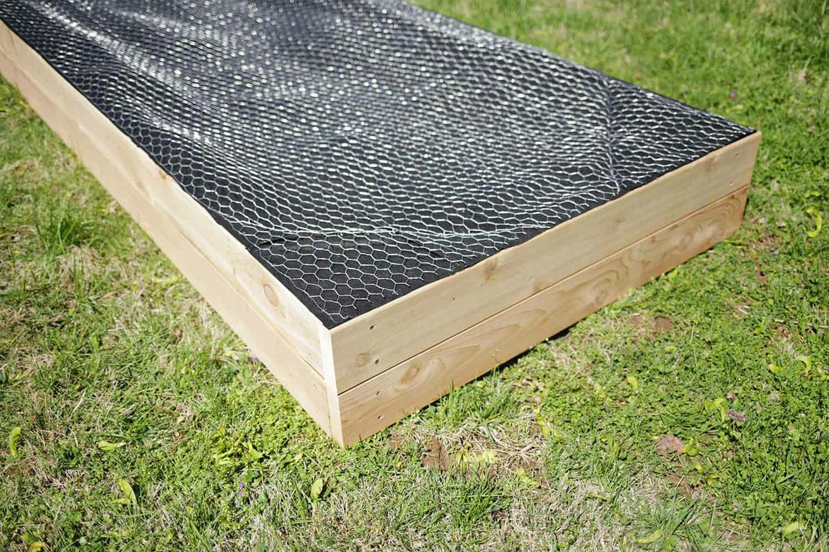 Y para conseguir que quede más fuerte coloca dos capas de malla antihierbas, poniendo primero bandas en sentido horizontal, y después en sentido vertical. Por último, añade una capa de malla de alambre de gallinero para evitar los ataques de topos y otros animales.