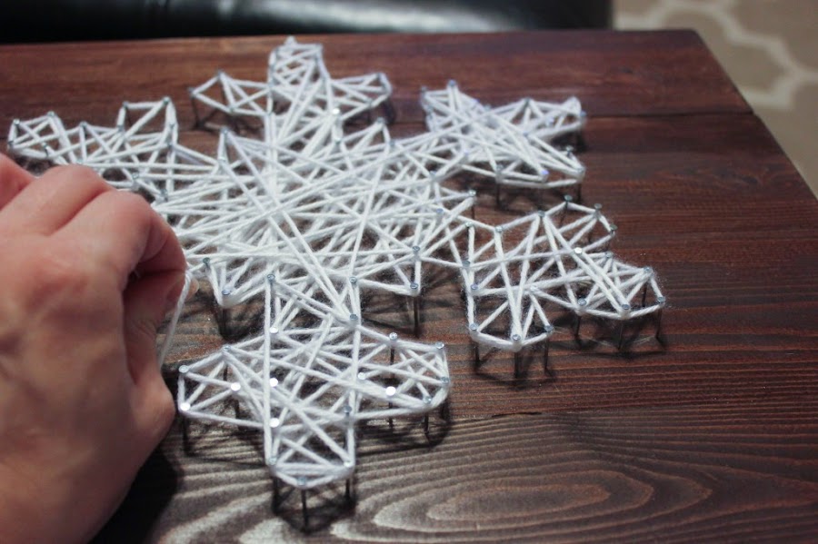 Este copo de nieve está realizado con la técnica de clavos e hilos tensados.