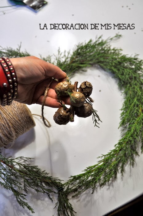 En este caso, una de las ramas tenía algunas piñas y las he aprovechado. Las he anudado a la corona con un poco de cordón de yute y ¡ha quedado genial en la puerta de entrada!.