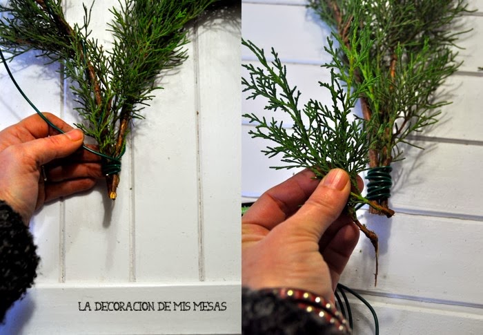 Una vez hemos puesto el alambre a las dos ramas, unimos. No importa si se ve el alambre, ya que podremos taparlo, más tarde, con unas hojas.