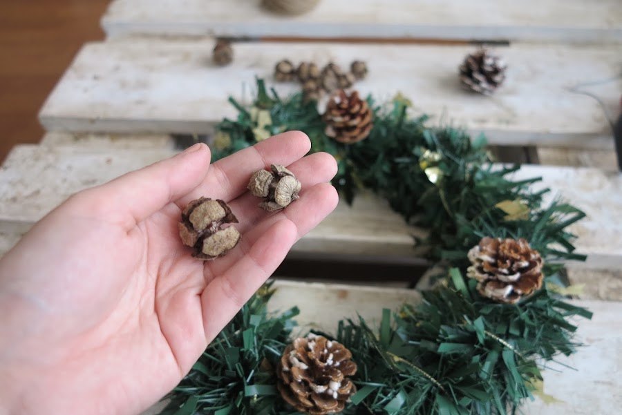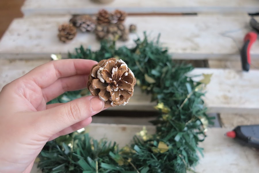 Ya solo nos queda pegar las piñas que nos darán ese toque natural a la corona.