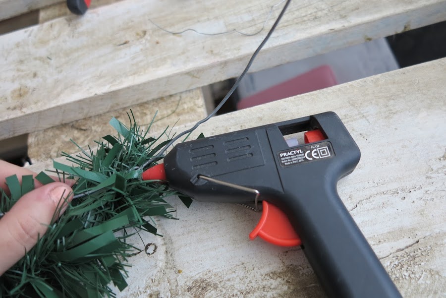 Luego con un poco de silicona caliente pegaremos un extremo del gupillón al alambre para así fijarlo y que no se mueva y daremos vueltas con el gupillón alrededor del alambre cubriéndolo por completo y pegando el otro extremo junto al primero.