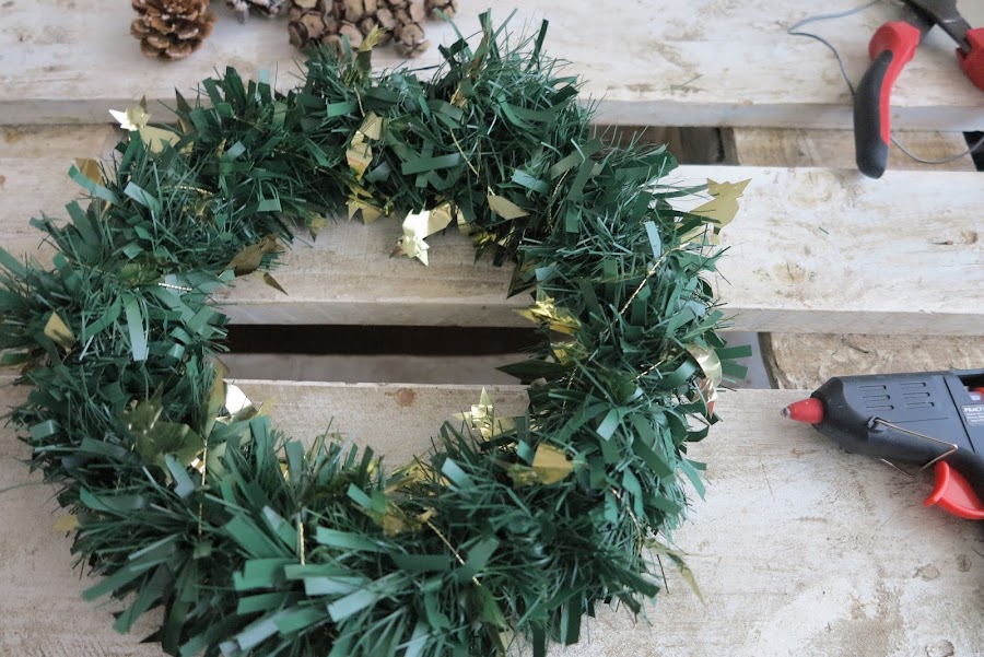 Después haremos el mismo paso con la decoración de color que hayamos elegido, en este caso una guirnalda dorada de zorritos, así damos un poco de color a la corona y la hacemos más navideña.