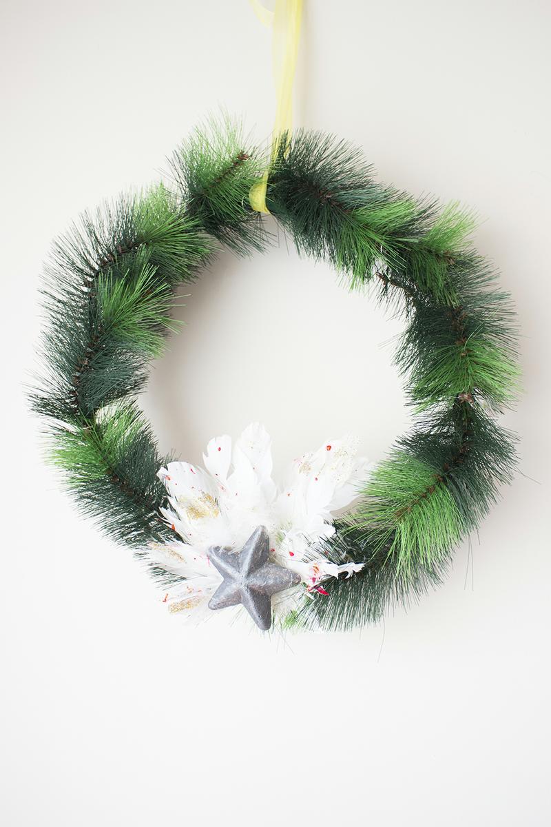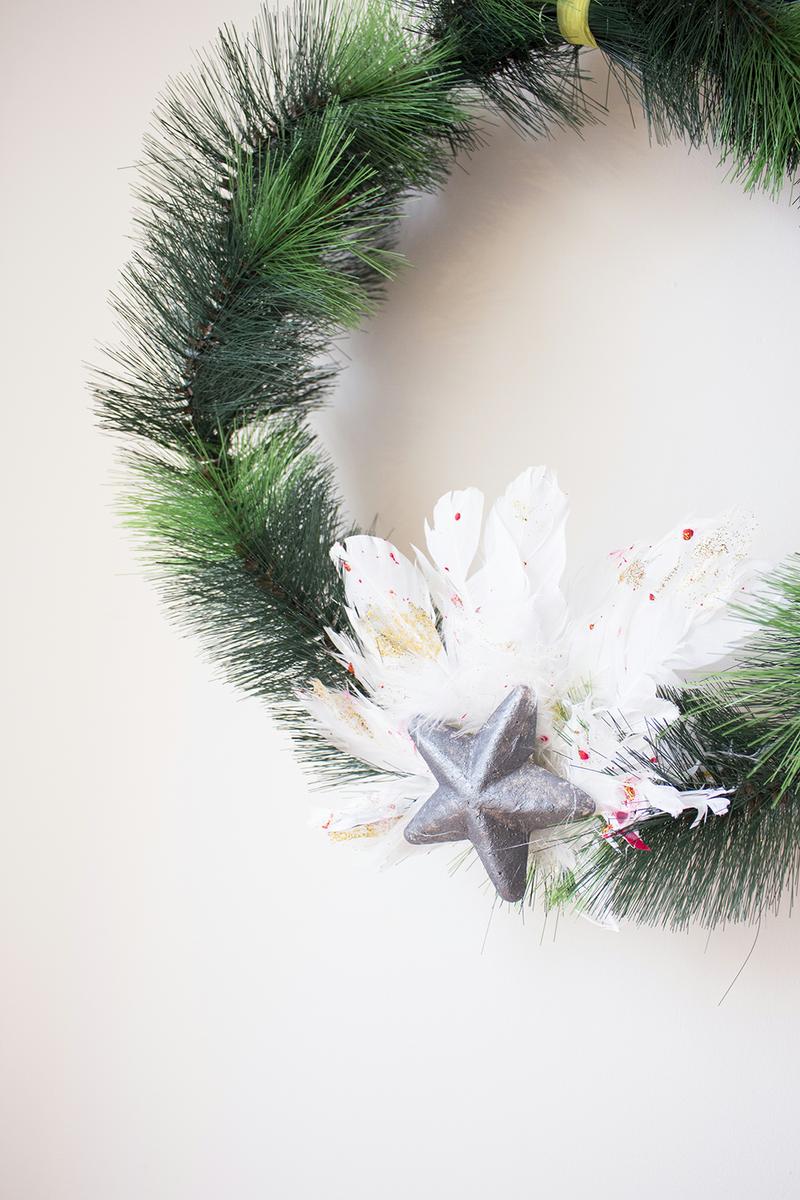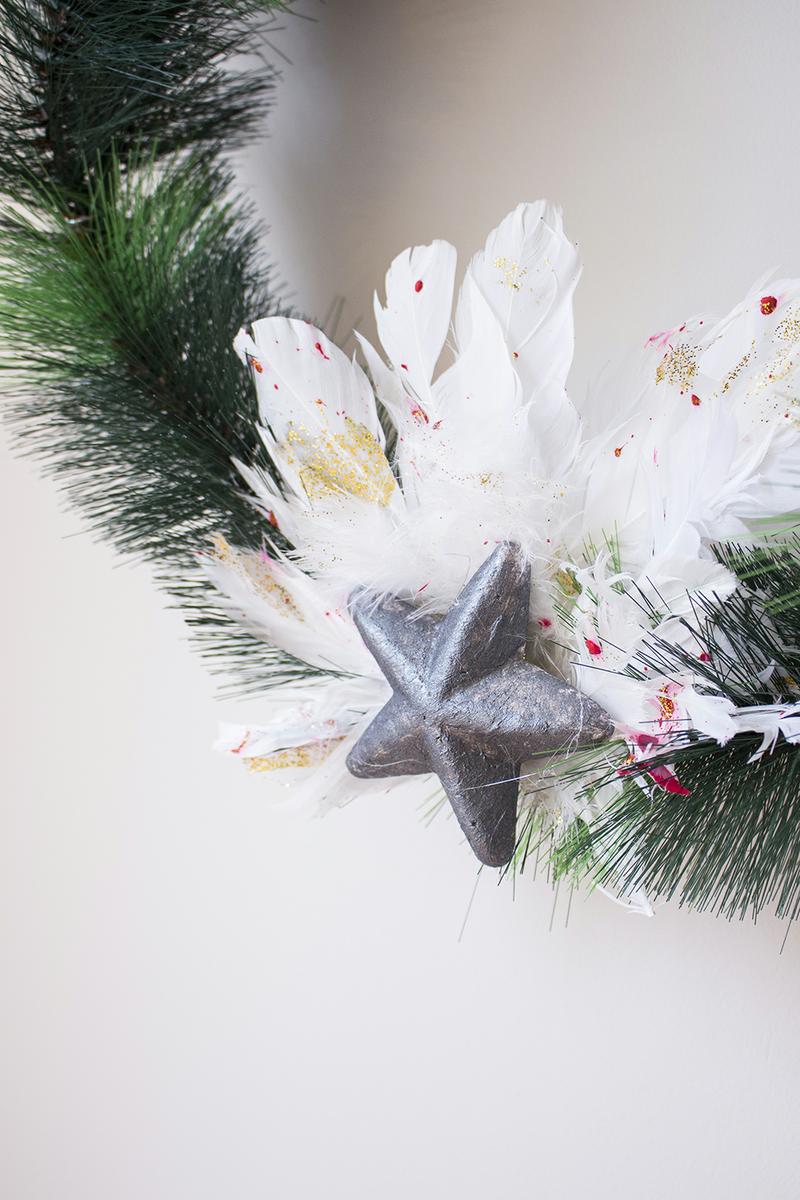 Con el alambre haz un aro de de unos 30 cm aprox (puedes hacer el tamaño que prefieras). Sujeta las ramas de pino al aro con alambre. La técnica que he utilizado para tintar las plumas, es la misma que usé para el taburete Bekvam así que protege todo bien para evitar manchar nada. Moja el pincel en la pintura rosa flúor y sacúdelo sobre las plumas. Cuando la pintura haya secado rocía las plumas con la laca para el pelo, espolvorea la purpurina dorada y vuelve a rociar con laca. Pega las plumas unas con otras, haciendo que quede un adorno bonito, puedes terminar de decorarlo poniendo una estrella o bola de navidad. Cuando esté el adorno montado pégalo en la parte inferior de la corona. Ahora pon el lazo para colgar y ya tienes tu corona lista.
