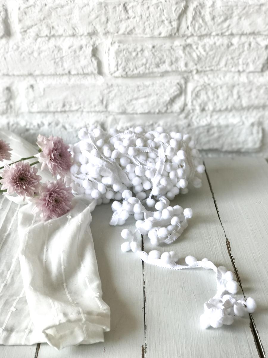 Así que sólo necesitamos unos 10 metros de tira de pompones blancos (unos 15 aprox) para darle su toque boho en dos sencillos pasos: