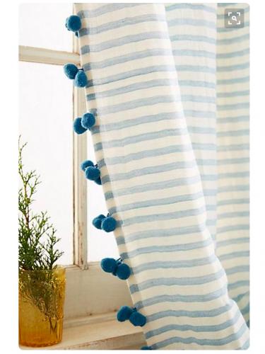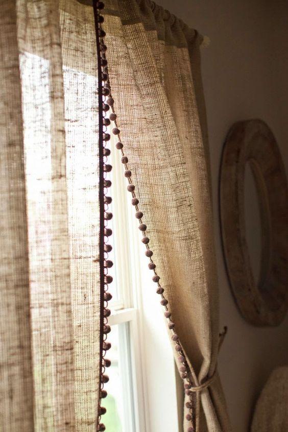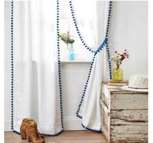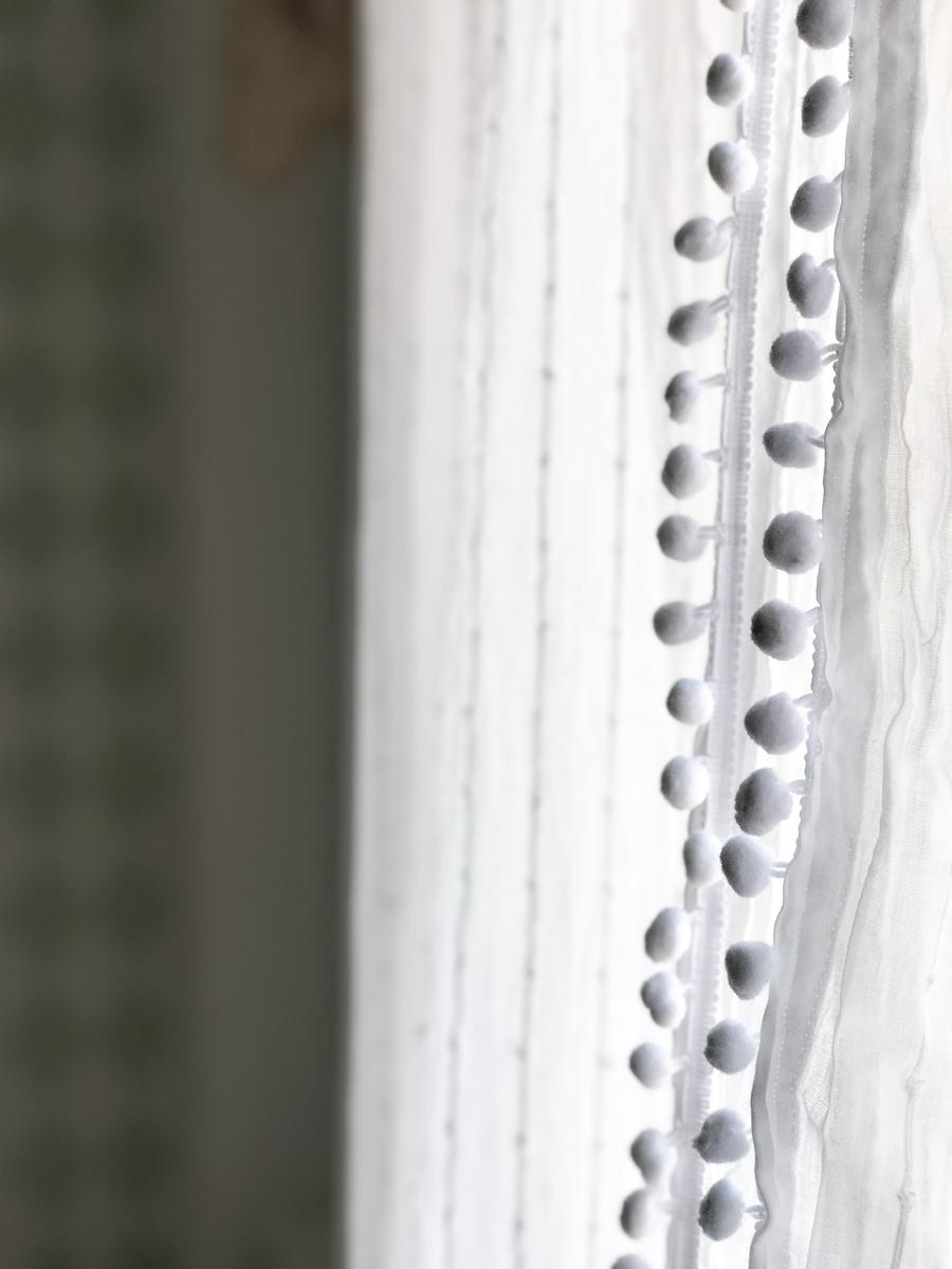 Ajustar con agujas la tira de pompones a ambos laterales de las dos cortinas, justo en el extremo.