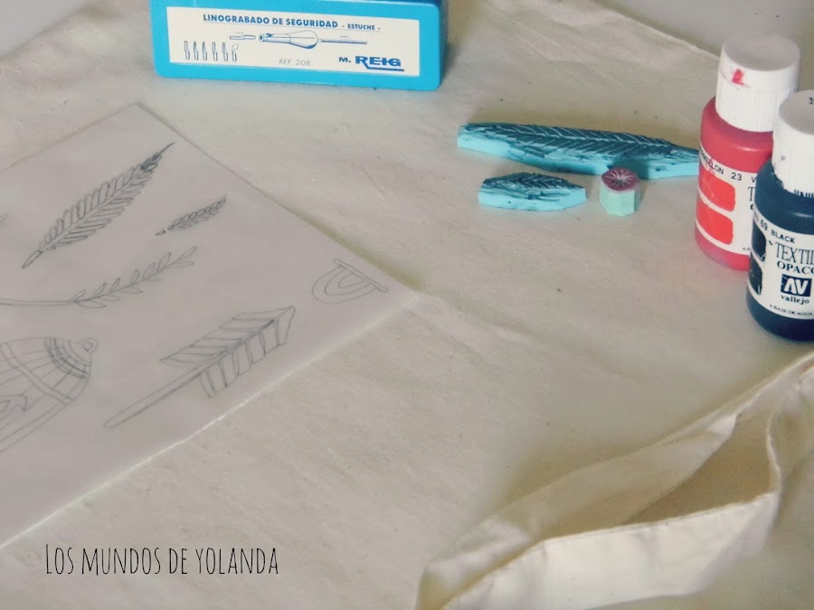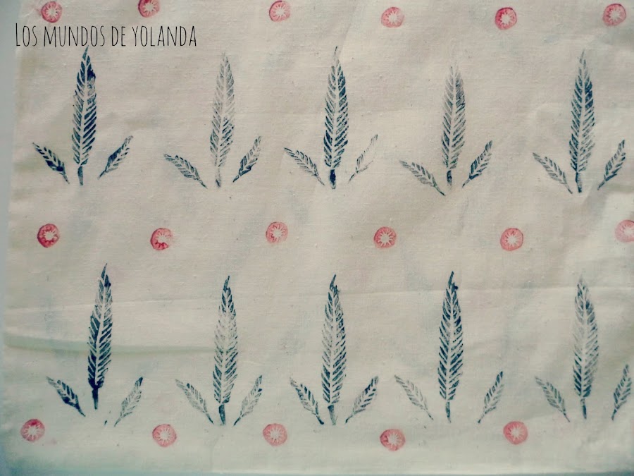 Hice los sellos y antes de poner tinta y estampar la tela, hice una prueba en papel y retoqué los sellos para que quedaran como yo quería.