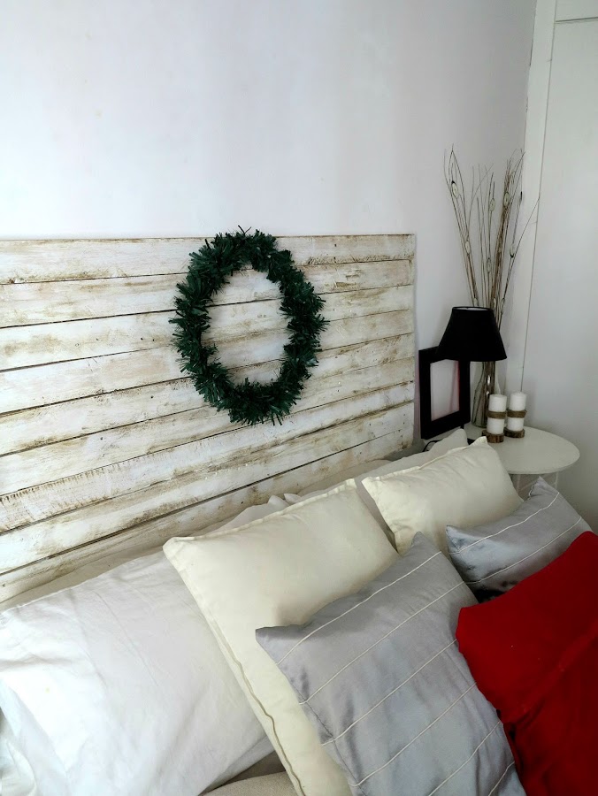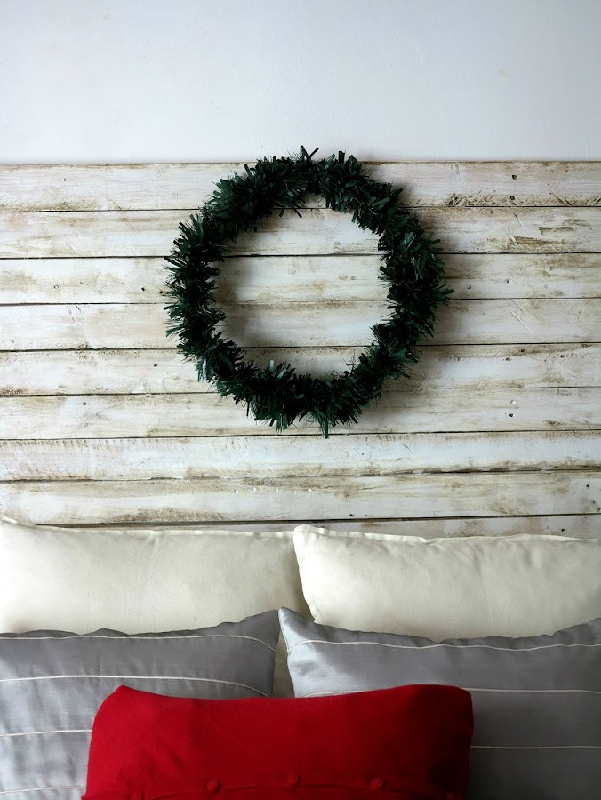 Para introducir el verde, que recordarse un poco al árbol de navidad, use una corona sencilla y grande (puedes ver como se hace aquí), sin ningún adorno para que no quitase protagonismo a los demás elementos, pero a la vez aportando otro punto de color y resaltando el punto focal que había creado con los cojines.