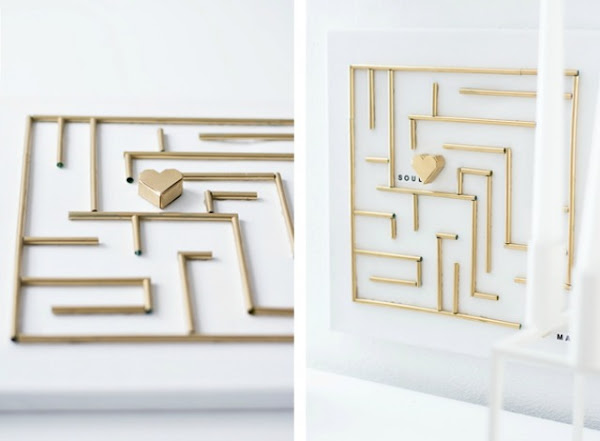 Un diy original, elegante y a la vez divertido con el que crearemos un cuadro de laberinto de oro en el que un corazón debe de encontrar el camino para llegar al otro..........bonito y romántico verdad.