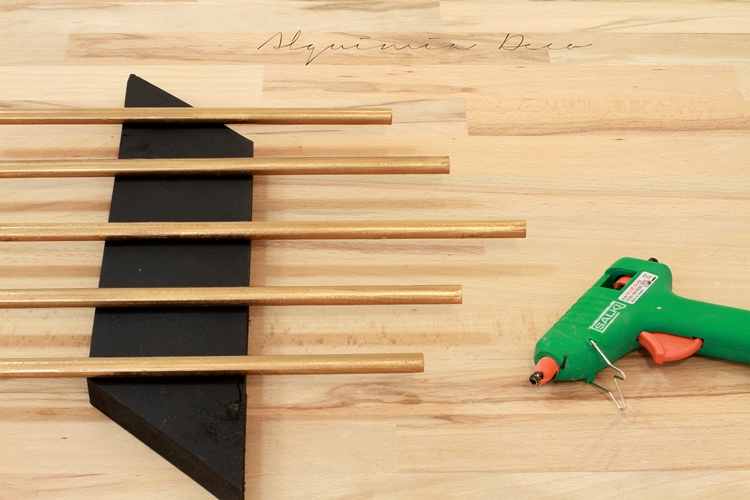 Lo primero que vamos a hacer antes de nada es lijar todos los palos y nuestro listón de madera, así nos ahorraremos cualquier susto de clavarnos alguna astilla a la hora de pintarlo. Una vez lijados, vamos a pintar nuestros palos, yo los he pintado de dorado, ya que quería darle un contraste fuerte.