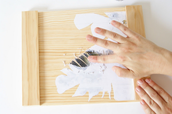 Aplica con la ayuda de un pincel el líquido tranfer directamente encima del dibujo a color y cuando lo tengas todo impregnado, gíralo y adhiérelo a la tabla de madera. Repasa el papel para que no queden burbujas.