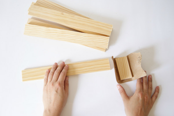 Una vez cortadas, vamos a lijar los cantos. Usa uno de los taquitos sobrantes de los listones y envuélvelos con la lija. Así te aseguraras que limas las asperezas de forma recta y con un acabado profesional.