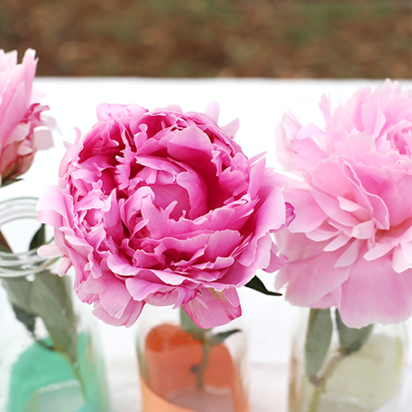 Se trata de unas viejas botellas de vidrio (bien pueden ser tarros de conserva), añadiendo una goma elástica y un poco de pintura podemos crear composiciones originales y llenas de color que alegrarán cualquier rincón de casa o de exterior.