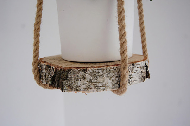 Solo necesitaréis una plantita y una rodaja de madera con algunas cuerdas. Materiales muy sencillos y al alcance de todas para alegrar cualquier esquina de casa.