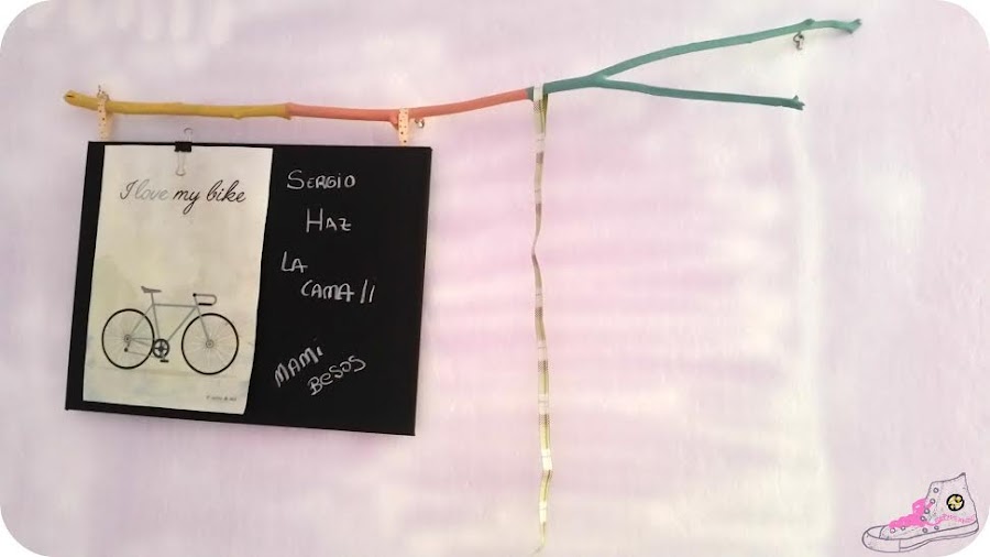 Pero quería darle un uso más decorativo, y al final he decidido que sea una especie de tabón de anuncios, y de recuerdos. Así que le he puesto unas cuerdas y con pinzas le he colgado un cuadro inspirador donde tiene la lámina que recibí en un intercambio y es pizarra con lo que puedo dejarle mensajes a mi peque. Y en las otras cintas le he puesto fotos de él con su hermana y sus primos, de las vacaciones y de sus amigos Scooby y Scrapy.