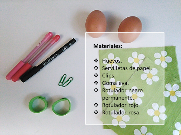 Para su realización tan solo necesitarás unos huevos, servilletas de papel, rotuladores y unos clips de papeles.....es tan sencillo que lo puedes hacer en compañía de los peques de la casa, que siempre es una buena opción.