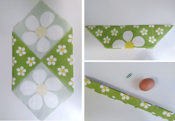 Envolvemos el huevo con la servilleta doblada y colocamos el clip.....ya tenemos nuestras orejitas del conejo.