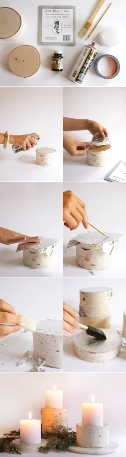 El segundo es para velas más grandotas. Necesitarás una rodajas de madera que puedes encontrar en las floristerías un poco grandes, pero seguro que en tu ciudad hay alguna, papel de plata, y si no quieres complicarte mucho, un poco de cola blanca. Puedes ver el paso a paso debajo de estas líneas.