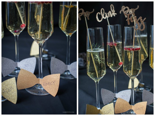 Uno de los momentos mas especiales de la noche es cuando oímos las doce campanadas y lo celebramos copa de champán en mano. Así que no nos podemos olvidar de decorar las copas con unas pajaritas brillantes, que además nos servirán para marcar el nombre de cada un de los invitados, y unos stirrers con letras impresas en papel de purpurina que encontrarás en estas plantillas imprimibles.