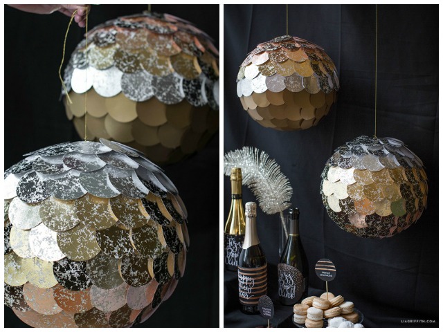 Ahora le toca el turno a esta bola de fiesta que podemos crear nosotros mismos facilmente. Para ello necesitaremos un sencillo farolillo blanco, pegamento o pistola de silicona y recortar círculos en papel de acabado metálico dorado, plateado, cobre y bronce. El tutorial completo lo encontrarás de nuevo en el blog Lia Griffith .