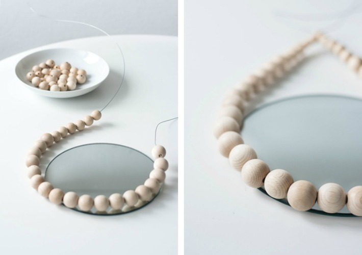 La autora de este precioso espejo pertenece a uno de mis blogs favoritos sinnenrausch nos comenta que si preferimos que tenga algo de color nuestro espejo solo tenemos que rociar previamente las bolas de madera con pintura en spray del tono que mas nos guste.