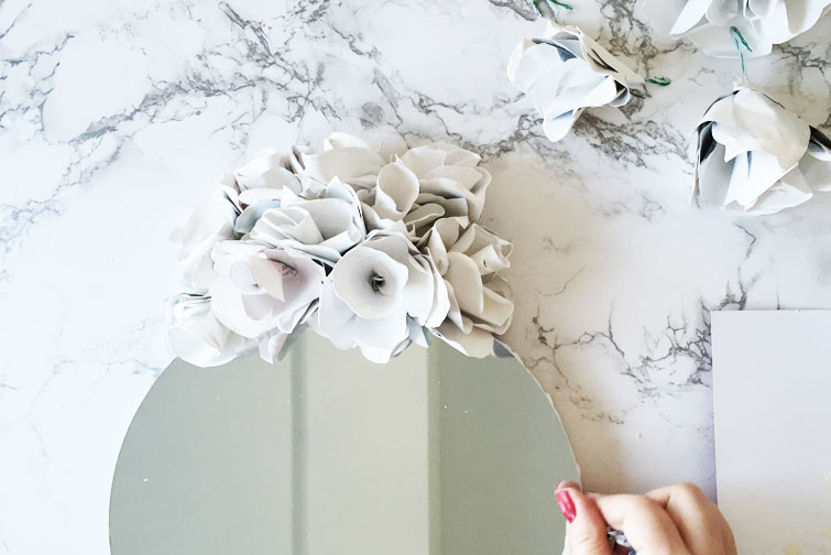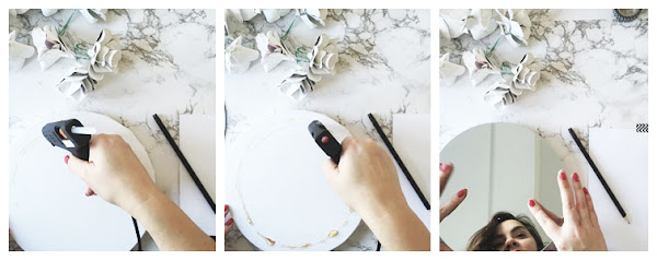 Con ayuda de la silicona, vamos pegando las flores al espejo. Cuidado con no quemarse!