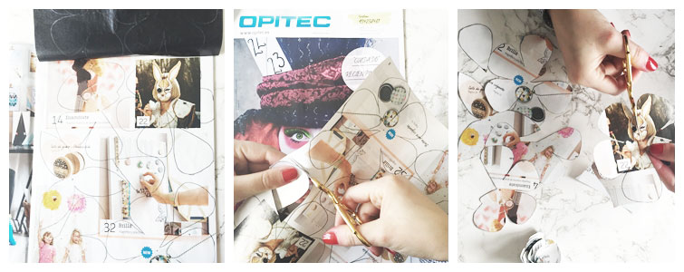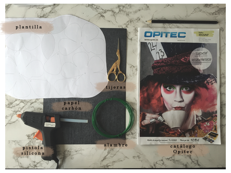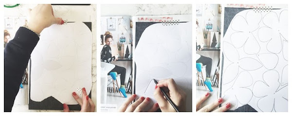 lo primero que vamos a hacer es sujetar con washi la plantilla y la hoja de papel carbón al catálogo. Luego marcamos la silueta de las flores con un lápiz