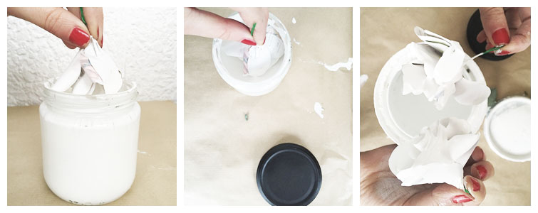 Una vez que están blancas y el papel tiene más consistencia, las metemos en pintura tipo chalky para darles grosor a las puntas, y que adquieran volumen (solo lo hicimos con el espejo en blanco)