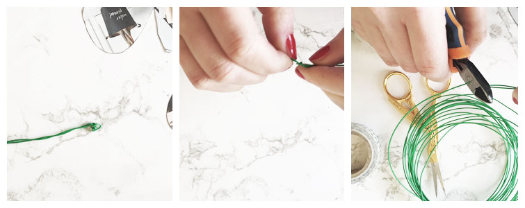 Con el alambre verde de floristería, fácil de manipular, hacemos los "rabitos". Lo mejor es dejar una "bola" en la punta que nos ayude a que la flor sea estable.