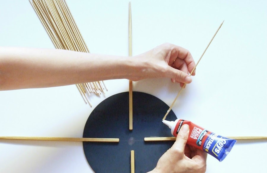 2 Paso . Marcamos el centro y pegamos los palitos chinos en la posición de las agujas del reloj, 12-3-6-9 y el resto de los palitos los vamos pegando entre estos cuatro ,que marcarán la posición, mientras más palitos más tupido y más bonito se verá , así que os recomiendo poner cuántos os sea posible.