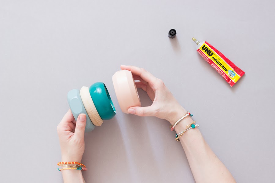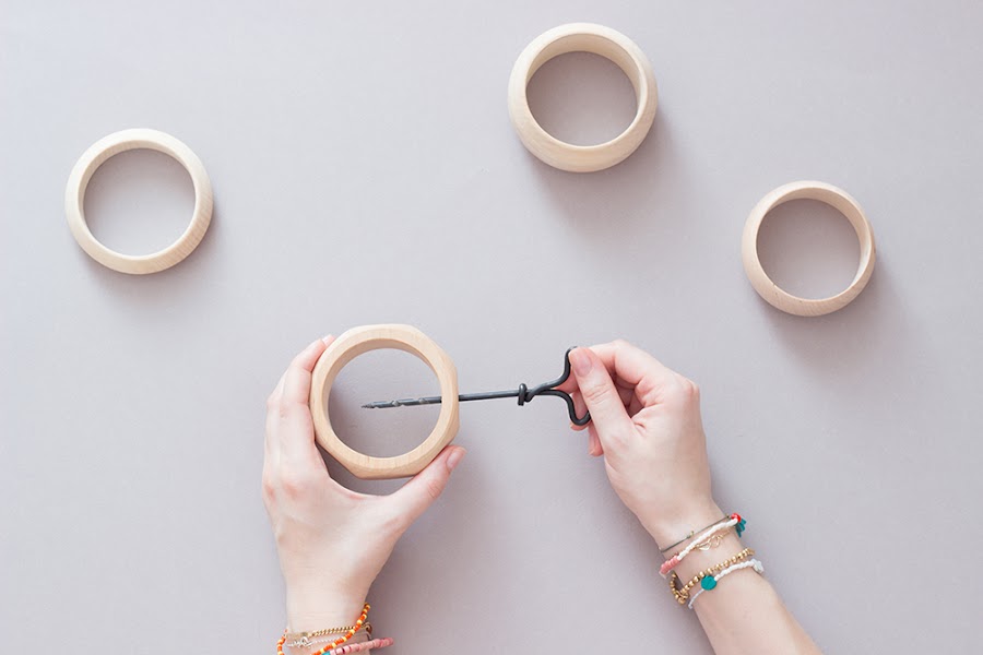 Luego, toma la pulsera que irá abajo del todo y, usando la barrena, haz un agujero para pasar el cable de la lámpara. Ahora, ¡pinta las pulseras de los colores que más te gusten! o incluso podéis dejar alguna con su color natural de madera si os gusta, quedaría estupendamente con cualquier color que lo combinéis.