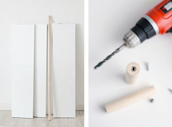 A continuación, haremos 4 agujeros en los estantes, que será donde luego roscaremos los listones de madera, por lo que es importante medir bien y que los agujeros estén a la misma distancia en cada lado. En estos agujeros, es donde colocaremos las tuercas de embutir.