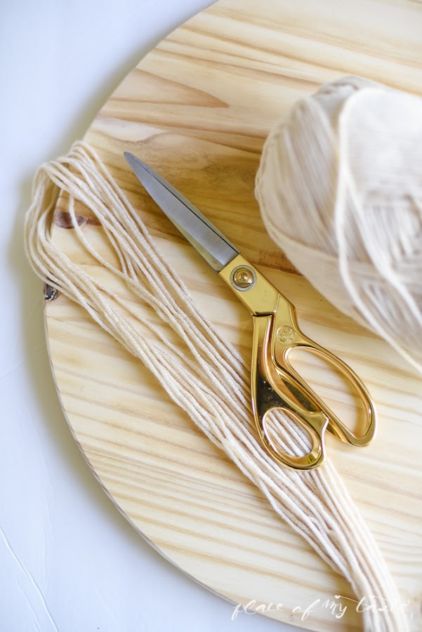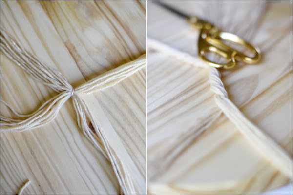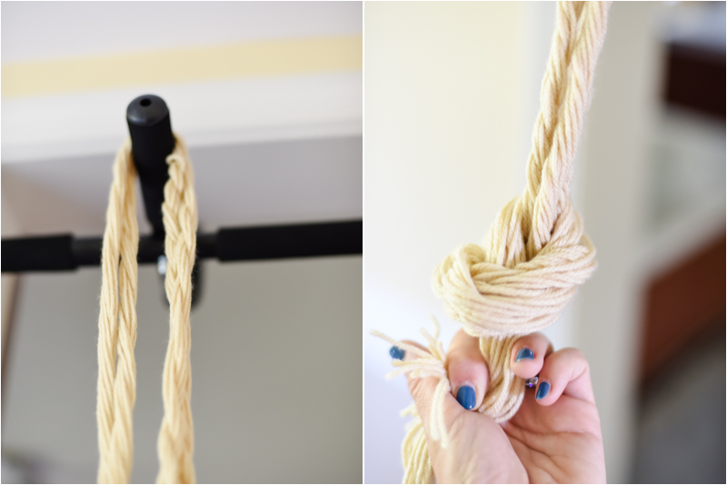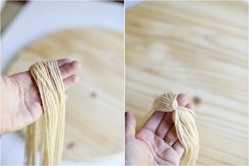 Corta unos 50 trozos de hilo de 1,37 metros de largo, uno de los hilos envolverá a todos los demás (como se aprecia en la foto) y hazle un nudo, intentando que quede lo más centrado posible, pues será la pieza central de la cuerda colgante.
