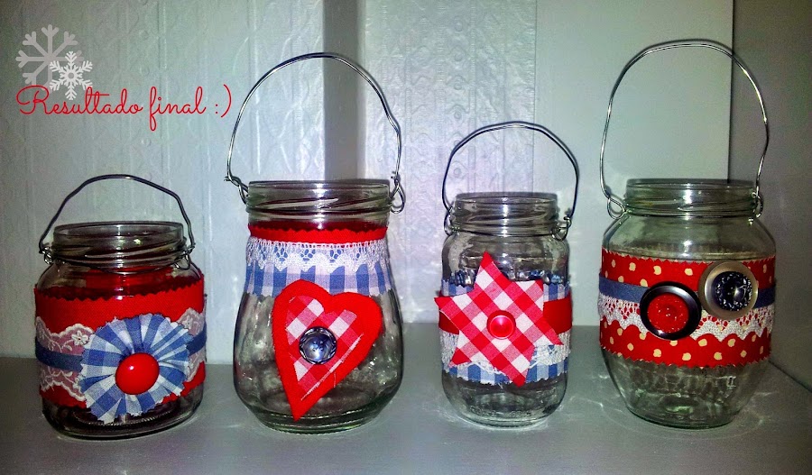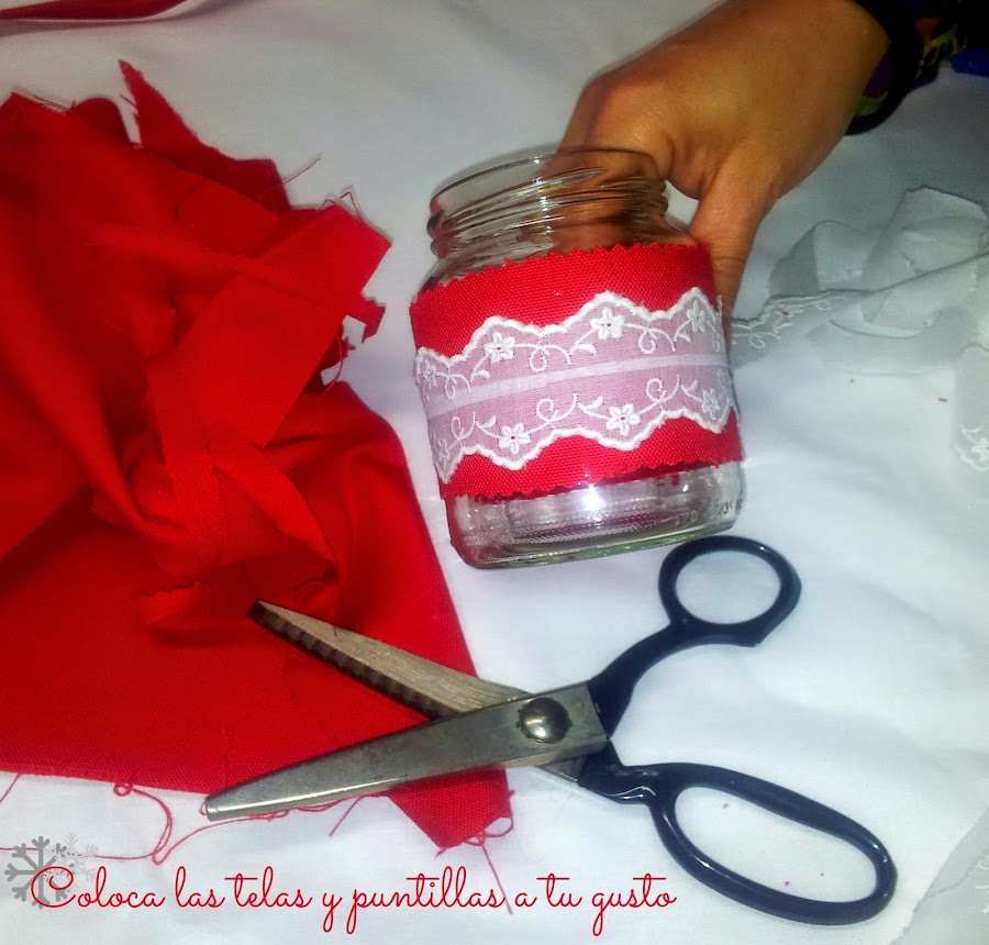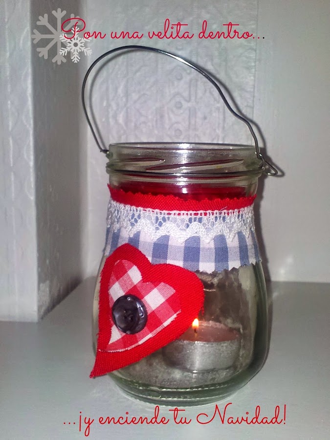 Este año, entre el millón de cosas bonitas que vimos, encontramos una especie de farolillos navideños hechos con tarros de conserva de cristal y trozos de tela que me encantaron. Inmediatamente pensé: ¡esto es un DIY para el blog! Y, dicho y hecho, aquí tenéis el resultado :D* Materiales y Herramientas *
