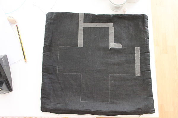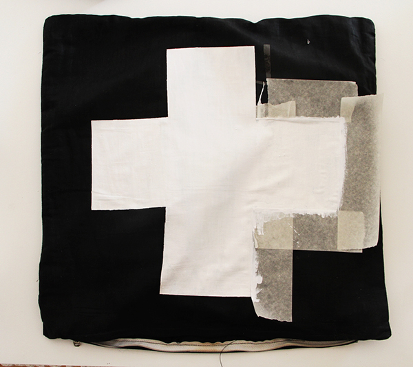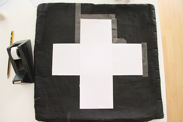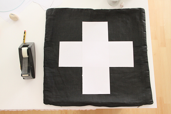 Después colocaremos los trozos de papel que tenemos encima de nuestra funda de cojín formando una cruz.