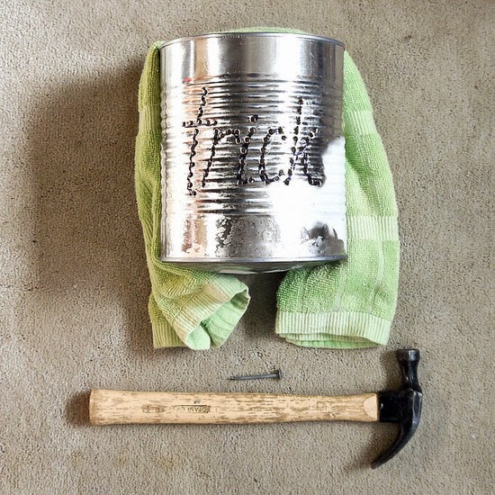 4. Si es posible, trabaja en una área cómoda para ti , como en el jardín, una mesa grande o sobre una alfombra, coge una de las latas con el trapo para protegerte del hielo y para que no se resbale la lata . Poco a poco empezar a martillar el clavo en las letras, dejando un pequeño espacio entre los agujeros. Continúa clavando hasta que se hayan formado las palabras.
