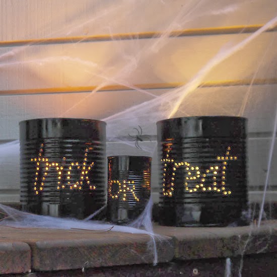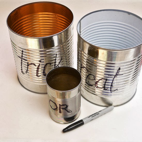 Estas latas tan originales de truco o trato (trick-or-treat), también las podrás hacer con otros dichos, como "BOO", o dibujar los contornos de rostros fantasmagóricos o murciélagos, para tener una colección básicamente de Halloween gratis y poder guardar para el próximo año