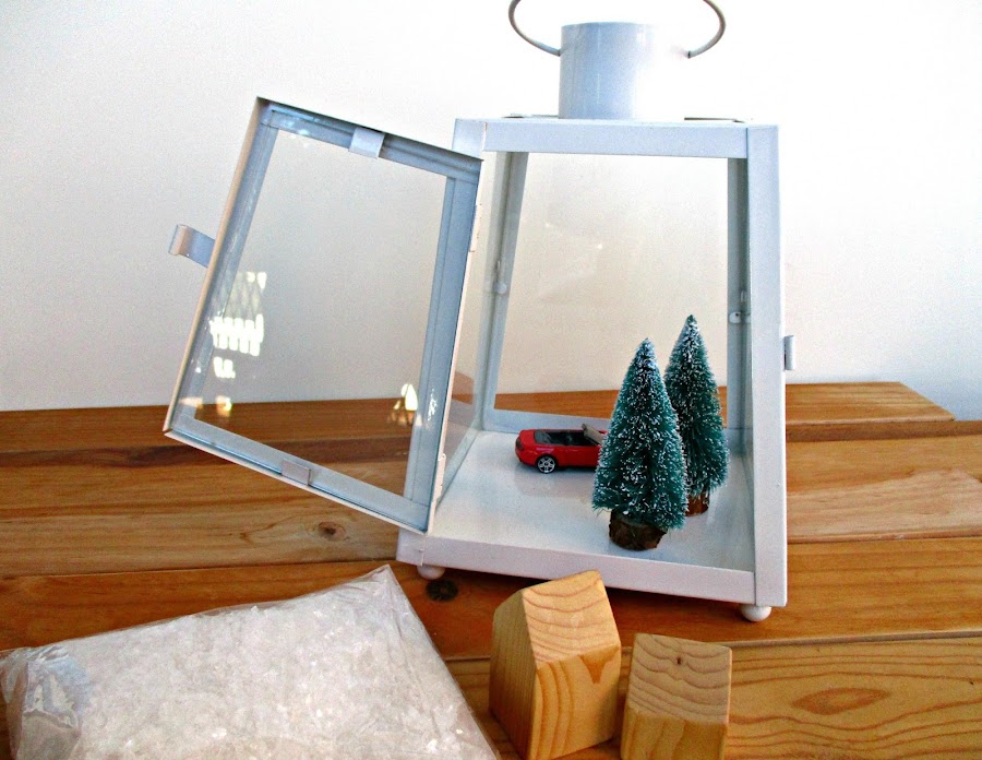 Ya tenia el farol, ahora me faltaba ver que iba a poner dentro. Y bueno, después de pensar un poco, se me ocurrió hacer algo en plan "vuelve a casa por navidad" o algo así jajaja, si lo se, es muy rollo de anuncio de la tele. Así que cogí las mini casitas de madera que hice hace ya tiempo y solo tuve que comprar los arbolitos, el coche y la nieve. Por cierto, menos el coche, todo lo demás lo vendían este año en Tiger.