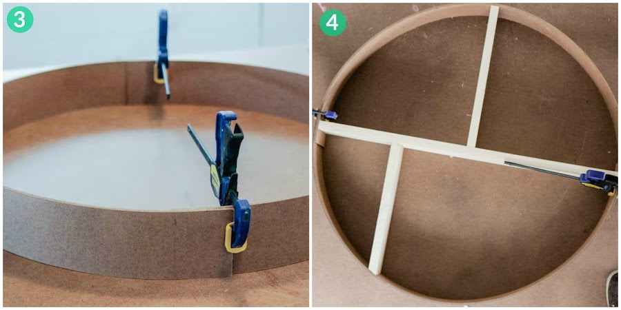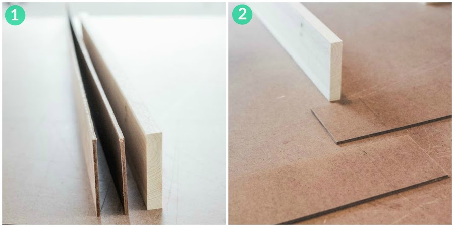 Pasos 1 y 2: Una vez tengamos los materiales vamos a cortarlos primero. Necesitamos dos tiras de MDF que sean de 120 cm y 1 tabla de 72.8 cm, otra de 34.4 cm y otra que tendremos que cortar en función al lugar donde vayamos a ponerla (las medidas que os doy las he sacado del blog original y venían pulgadas y os las he pasado a cm, y para alguna duda os aconsejo visitarlo o aplicar un poco de matemáticas al asunto). Una vez todo cortado dejamos unos 7,5 cm. de solape en las piezas de MDF que vamos a usar para la circunferencia.