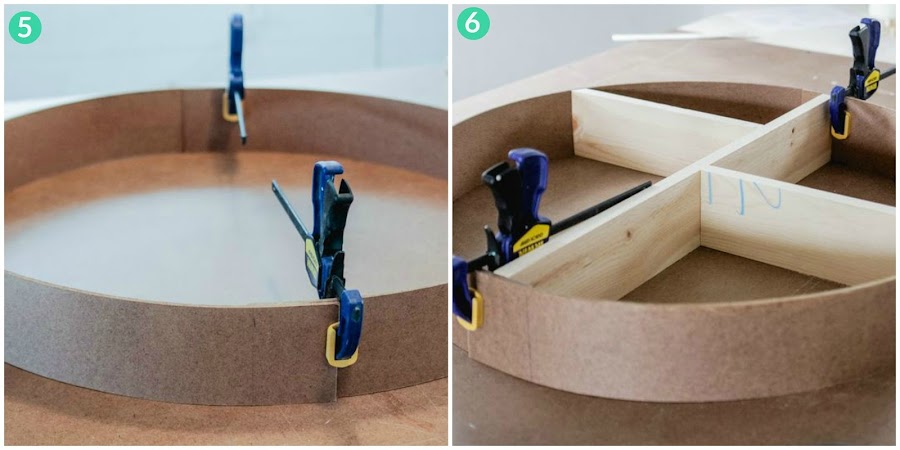 Pasos 3, 4, 5, 6, 7 y 8: Sujetamos las piezas exteriores con unas sargentas y las solapamos hasta la señal que hemos hecho antes. Luego colocamos las maderas para ver si todo cuadra bien (en este momento es cuando tendríamos que tomas medidas para la tabla que nos falta por cortar). Una vez todo este en orden atornillamos las maderas entre si para fijar bien la estructura interior, comprobamos que este en su sitio la estructura y la atornillamos a las piezas exteriores.