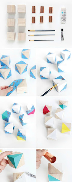 Tan solo necesitamos cubos de madera natural (lo venden por ejemplo aquí) cinta de carrocero para hacer las líneas que más os gusten, triangulos, cuadraditos o si me apuráis podéis pegarle pegatinas de estrellitas o círculos y a pintar. Una vez tenéis todo pintado como podéis ver en la foto solo falta pegar el tubo de cobre y LISTO!