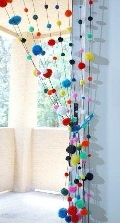 También podemos colocar cortinas en una puerta para darle color; y en los extremos de cada hilo colocamos una borla. Usamos varios colores. Recuerden que algunos colores a veces no combinan, todos juntos sí lo hacen.