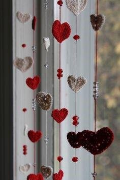 Para las románticas o para el cuarto de las niñas, podemos tejer corazones al crochet, hilvanarlos y colocarles piedras de colores o transparente para que la mezcla de texturas le de notoriedad.