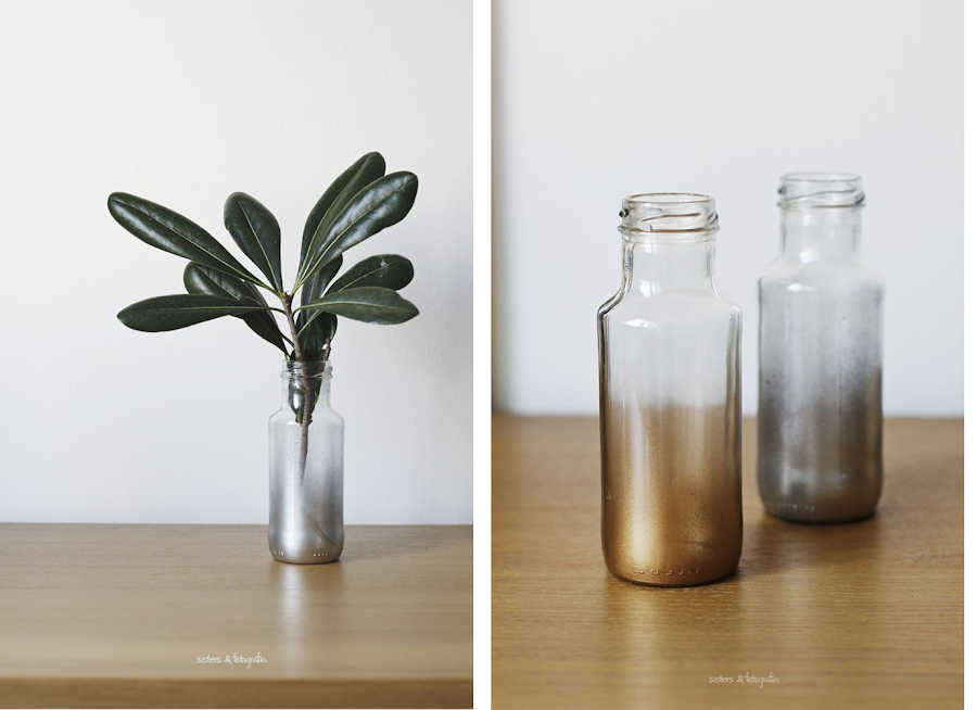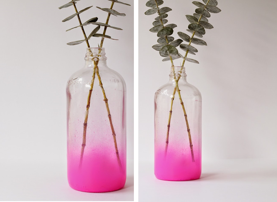 Puedes reciclar botellas de cristal de zumo o agua que te parezcan que tienen una forma bonita y en 5 o 10 minutos tendrás unos precioso jarrones degradé.